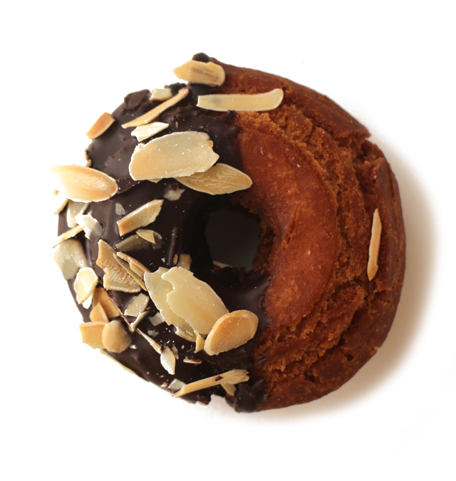 オールドファッションにチョコをかけ、アーモンドスライスをトッピング。甘さとパリパリとした食感がたのしめます。